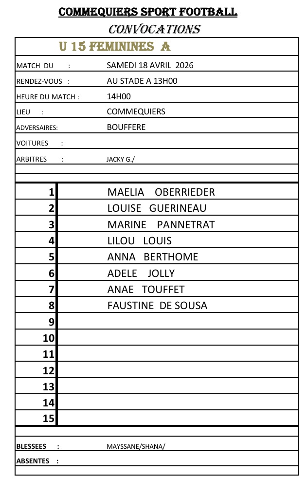 | Équipe | Date | Horaires | Adversaire | amical | championnat | Resp. salle | Resp. buvette | |